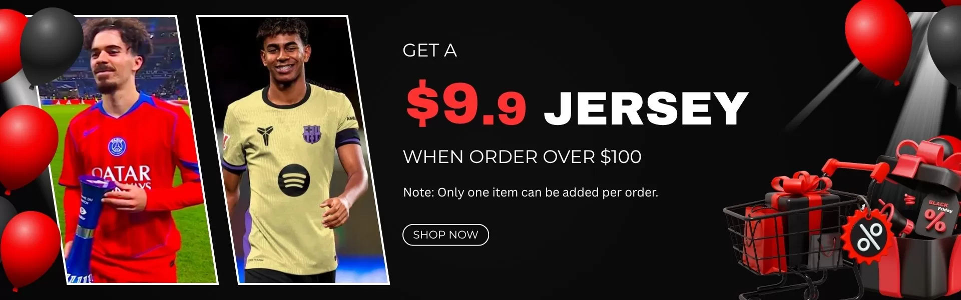 Black Friday Mega Deal! Spend $100 and get one discounted jersey for $9.9. Note: Discounted jerseys cannot be used with coupons. Offer ends December 2 (EST).