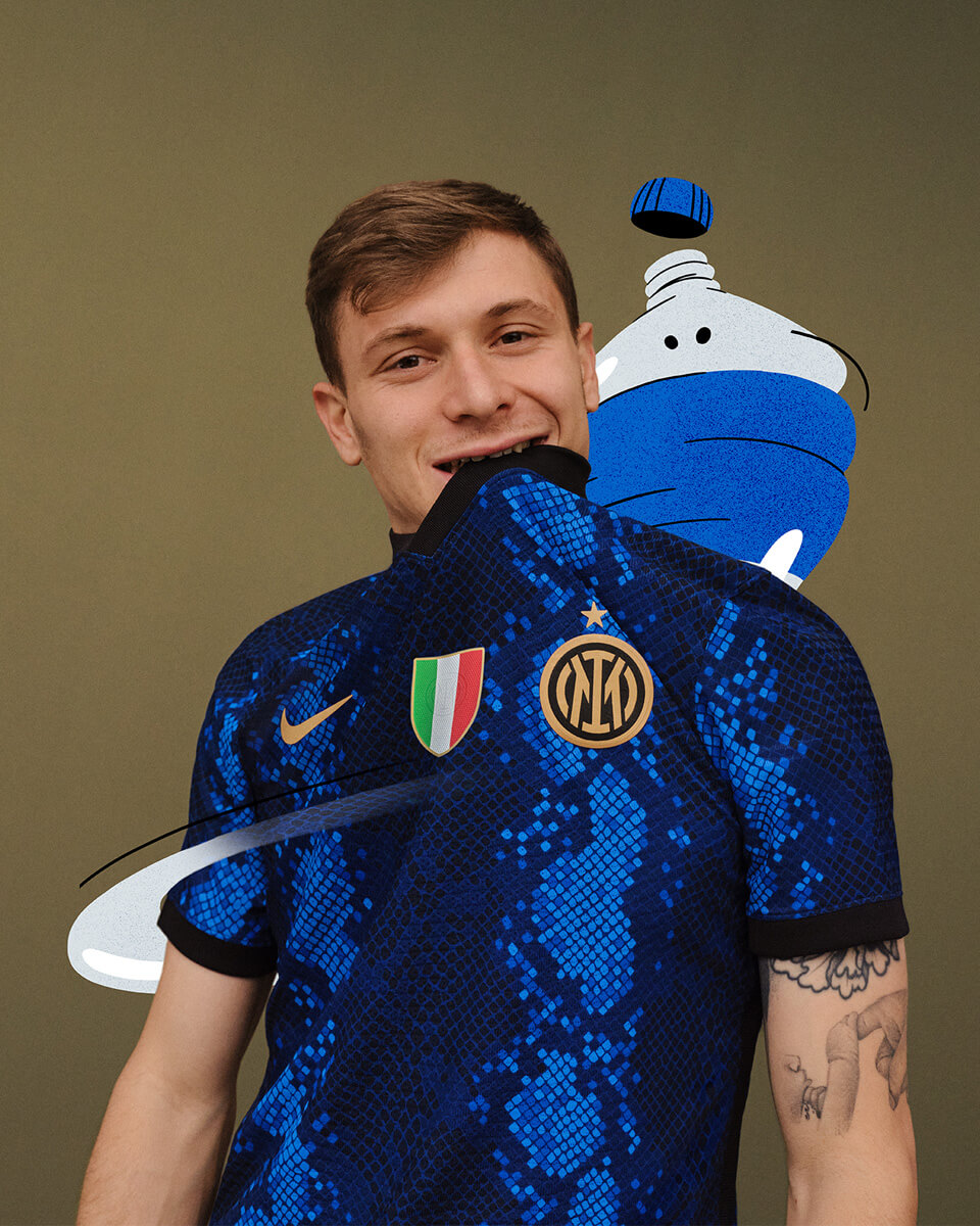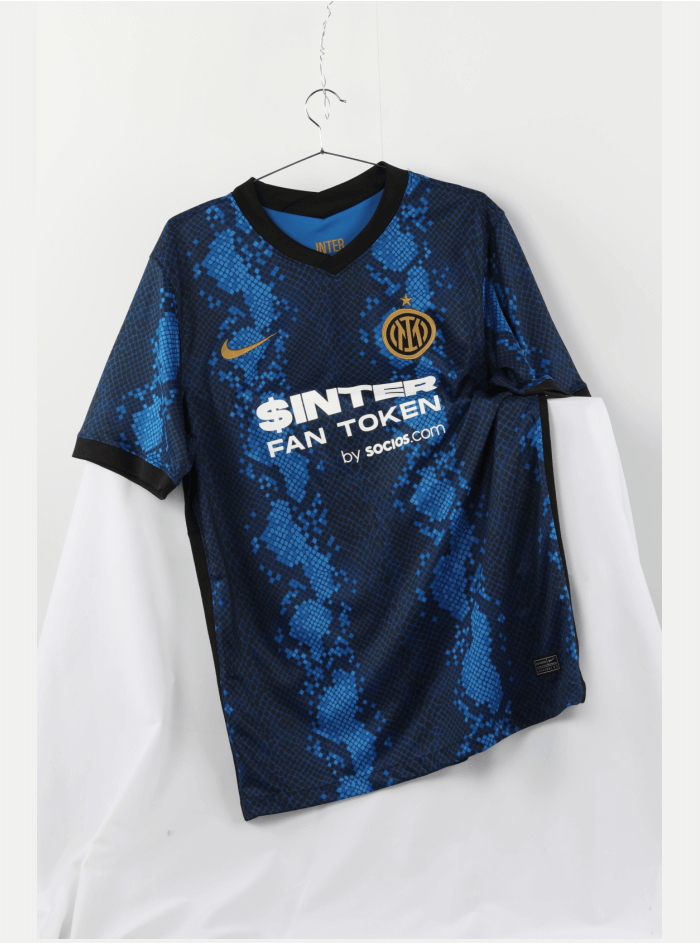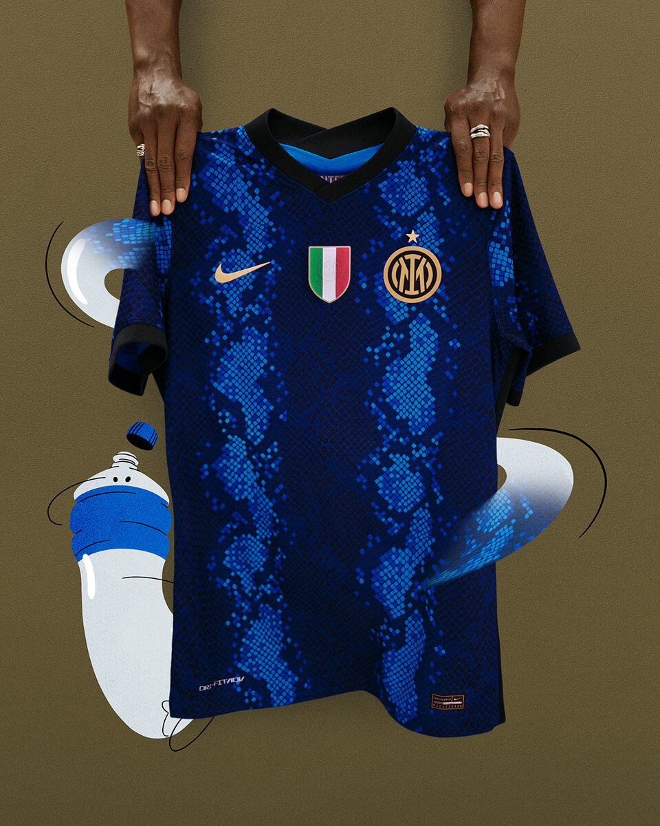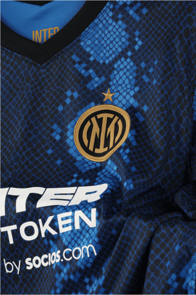 On the Inter Milan jersey 2021, royal blue, navy blue and black mimic the shape of snakeskin in pixel style, reinterpreting the club’s iconic Nerazzurri stripes. The snakeskin pattern is a tribute to the snake spirit (Biscione), it is an important historical symbol of the city of Milan and the club. This jersey is also the first time in ten years that the club has a snake as the theme at home.